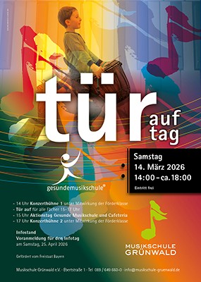 Bei unserem „Tür auf Tag“ (14.00 – ca. 18.00 Uhr) können Sie die Musikschule Grünwald mit ihrem vielfältigen Angebot kennenlernen. Im Rahmen der beiden Konzertbühnen im August Everding Saal (14.00 und 17.00 Uhr) präsentieren unsere jüngsten Talente zusammen mit Schüler*innen unserer Förderklasse zwei abwechslungsreiche musikalische Programme. Von 15.00 – 17.00 Uhr informieren die Fachlehrkräfte in den Räumlichkeiten der Musikschule über das gesamte… |