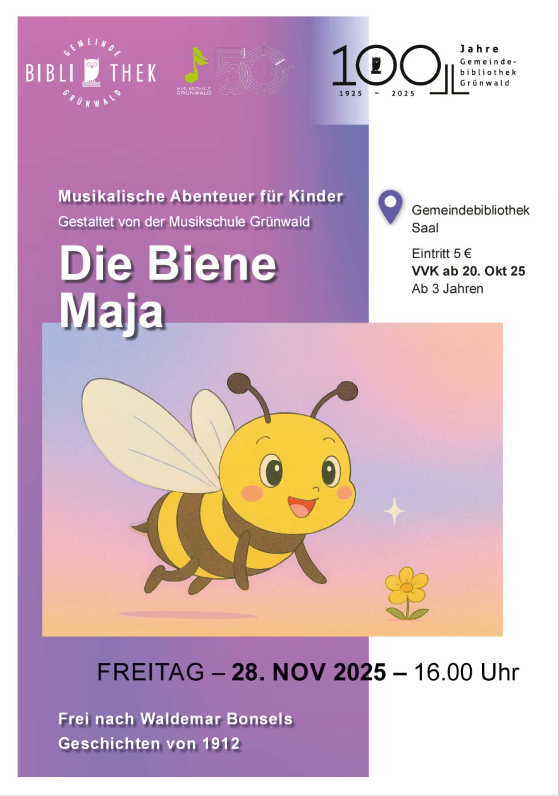 Gemeindebibliothek Grünwald Südl. Münchner Str. 7, 82031 Grünwald, BayernAnlässlich des 100-jährigen Jubiläums der Grünwalder Gemeindebibliothek gestaltet die Musikschule in Kooperation dort ein musikalisches Abenteuer für Kinder ab 3 Jahren. Musikalische Leitung: Nina Burkart, Katharina Stübinger, Isabella v. Kuepach, Anna Zimmermann Eintritt: € 5,- Vorverkauf: ab 20. Oktober in der Gemeindebibliothek (Südl. Münchner Str. 7)
