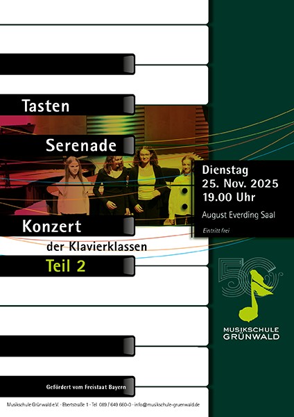 August Everding Saal Ebertstr. 1, Grünwald, DeutschlandIn einer zweiten pianistischen Abendmusik widmen sich die Klavierklassen der Musikschule einem stilistisch breit gefächerten Repertoire: auf dem Programm stehen Werke aus der Frühzeit der Klaviermusik im 18. Jahrhundert bis hin zur Moderne. Ebenfalls im Programm vertreten sind auch wieder Beiträge mit musikalischen Gästen aus den anderen Fachbereichen. Eintritt frei