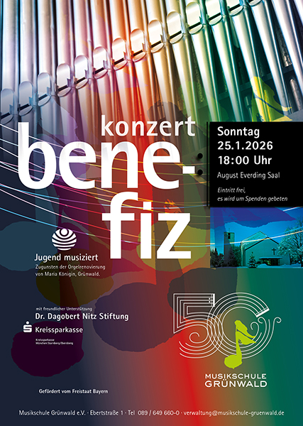 August Everding Saal Ebertstr. 1, Grünwald, DeutschlandJährlich nehmen zahlreiche Schüler*innen der Musikschule Grünwald an den Wettbewerben "Jugend musiziert" in Grünwald und München teil und werden durch die Kreissparkasse München Starnberg Ebersberg und die Dr.-Dagobert-Nitz-Stiftung in einer speziellen "S-Klasse" gefördert. Sie alle begeben sich in einem großen Benefizkonzert zugunsten der Orgelrestaurierung in der Kath. Pfarrkirche Maria Königin mit ausgewählten Werken aus ihren…