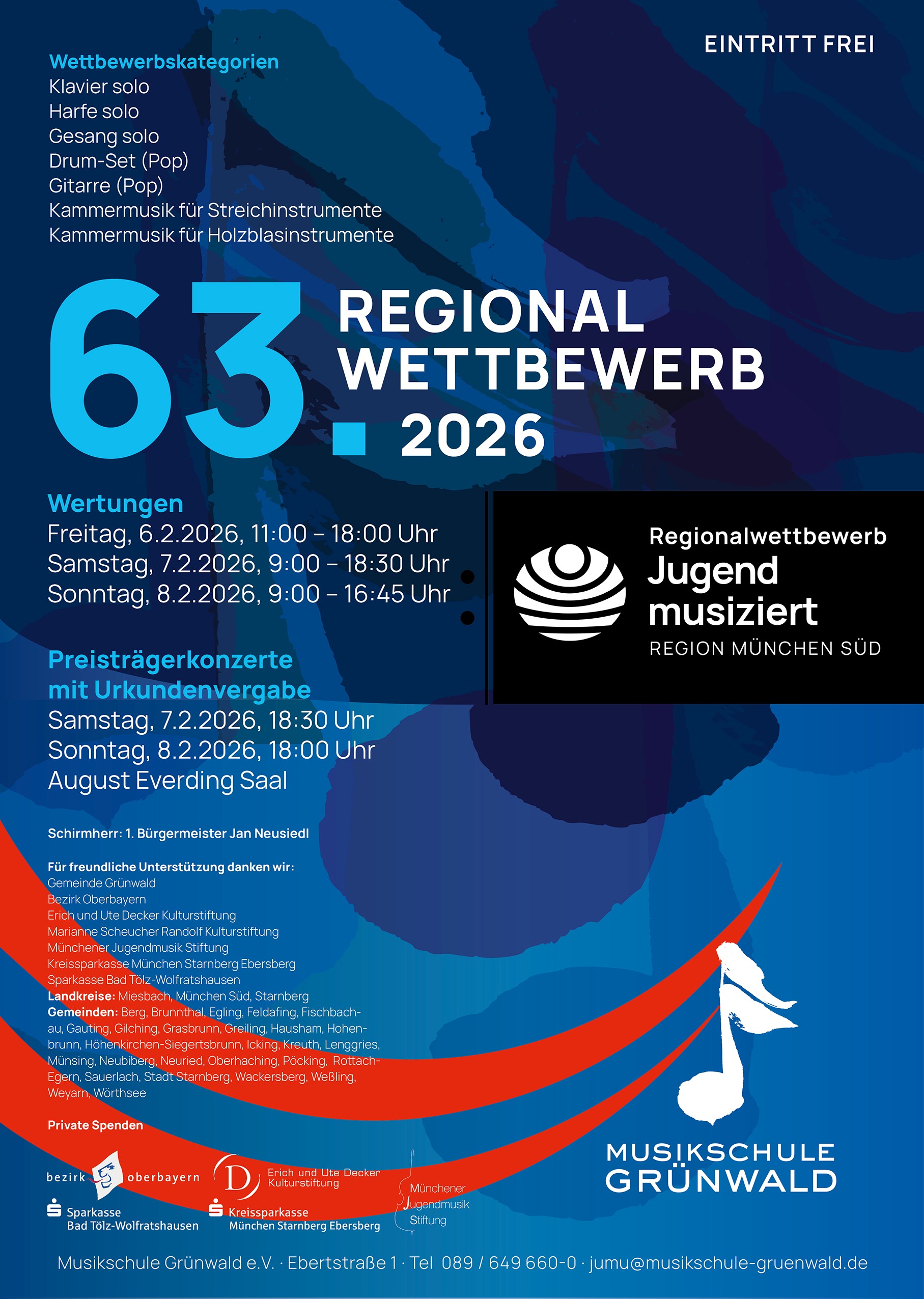 Seit über sechs Jahrzehnten zählt "Jugend musiziert" zu den wichtigsten Fördermaßnahmen der musikalischen Jugendbildung in Deutschland. Seit mehr als drei Jahrzehnten fest auch im Kulturleben Grünwalds verankert, ist der Regionalwettbewerb ein Anziehungspunkt für viele Teilnehmer*innen und Musikbegeisterte aus der ganzen Region. Höhepunkte sind die Preisträgerkonzerte, in denen die ganze Vielfalt und Begeisterung der jugendlichen Musizierenden…